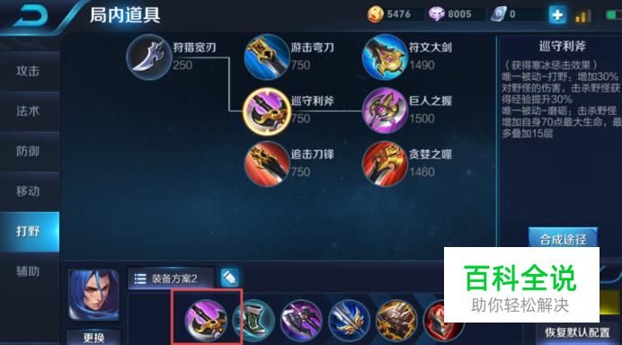 首先,橘右京最好是打野位,那样才能快速的成长,第一件装备可以选择出巡守利斧,这件装备在清野速度上面还是很不错的,我们不要将此装备升级到最高级别,那样只会拖累经济,到巡守利斧就可以了。