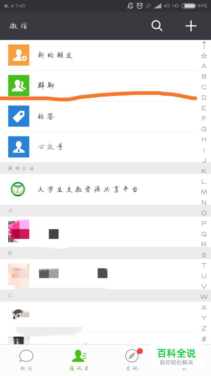 打开微信的页面,点击“通讯录”里的“群聊”,如下图所示