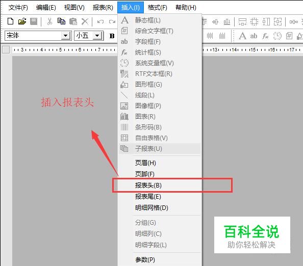 打开Grid++设计器,点击菜单栏中的插入菜单,如下图所示,点击报表头选项,报表的标题可以放在报表头里