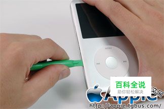 在另一侧,从iPod前盖和后盖之间的缝隙中插入iPod专业拆卸工具。 你会发现这样很容易就可以将iPod专业拆卸工具插入到iPod上部一角,并创造出一个足够大的缝隙。