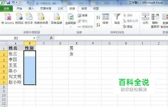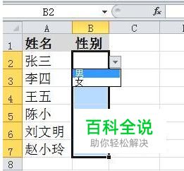 打开excel,在A列第一行输入“姓名”,在B列第一行输入“性别”,然后在E1、E2分别输入“男”和“女”。然后在上方工具栏切换到“数据”,再用鼠标选择B2-B7。