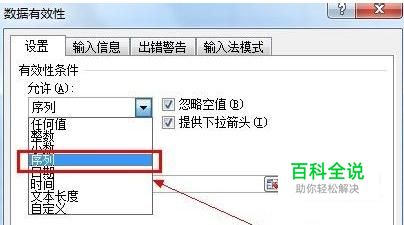 点击“数据有效性”→“数据有效性”,弹出数据有效性窗口。在“数据有效性”中选择“允许”中的“序列”。