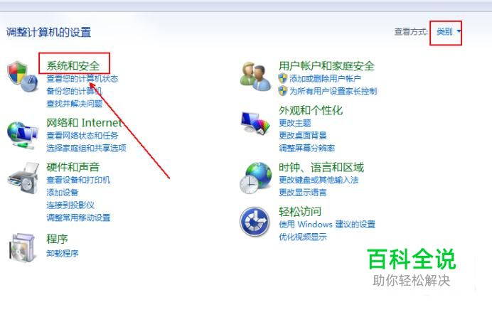 将“查看方式”更改为“类别”选项,点击“系统和安全”选项