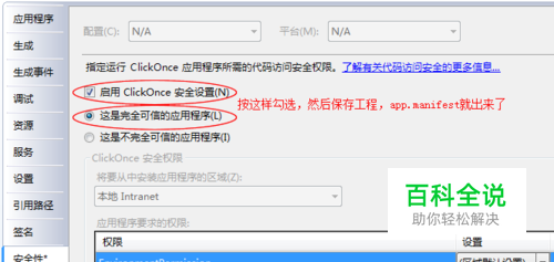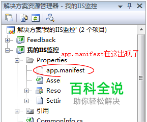 打开vs2010等工程,在【解决方案资源管理器】里查看是否有app.manifest这个文件,如果没有的话,通过以下方法创建:1、在【解决方案资源管理器】右键工程名称选择属性;2、在弹出的该对话框中,选择【安全性】选项卡。3、勾选【启用ClickOnce安全设置】,并选中【这是完全可信的应用程序】。4、保存工程,这时候app.manifest就自动创建了。