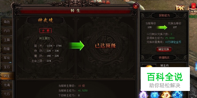 实力在雷霆之怒网页游戏中代表了一切,然而毕竟是凡人之躯,因此角色对于力量承受是有极限的,当身体的承受力达到极限想要提升就要另谋出路了。在众多贤者不断的尝试后终于领悟了一个新的境界-转生!转生是一次灵魂的洗炼,是对躯体的重组,能以凡人之躯承载更强大的力量!因此有勇士总结出了雷霆之怒快速转生攻略,让后辈们快速提升实力,抵抗恶魔的入侵。 转生修为是雷霆之怒快速转生的核心,只有转生修为达到一定数值才可以进行转生,同时有转生修为还是不够的,角色要达到80级后才能进行一转,角色一共可转生十次,每次转生后角色的基本攻击、防御、生命上限都会提升。 转生修为与玩家的等级是密切相关的,每天角色可以进行三次降级兑换转生修为,每次兑换可获得相应的转生修为值,兑换会降低角色一级并消耗10万绑定金币。如果角色等级低于80级则无法进行兑换的!等级越高兑换的转生修为更多,因此想快速转生就得快速升级,封魔谷副本是一个非常好的选择,海量经验五星推荐! 另外使用转生丹也可以快速获得转生修为,转生丹可以在商城内购买获得的,使用后可以获得1万转生修为,另外每日充值奖励也可以免费获得转生丹,这可比单独购买要划算多了!