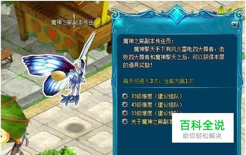 (1)点击地图旁边『活』→『副本』→魔神之殿,点击“前往”即可自动寻路前往魔神之殿副本传送员处。(2)找到帝都魔神之殿副本传送员,与其对话即可进入魔神之殿。