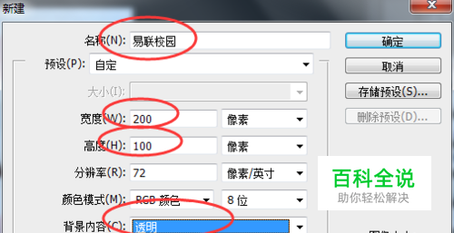 ⒈点“文件——新建”,新建一个图层,宽度和高度相等或不等皆可,只是成品图片上水印密度的差别。这里,我将宽度为200像素和高度100像素,分辨率是默认的72,背景选透明。
