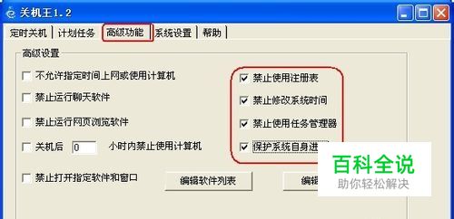 进行高级功能设置:禁止使用注册表、禁止修改系统时间、禁止使用任务管理器、保护系统自身进程。