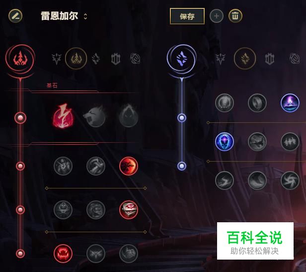 然后是符文的选择,雷恩加尔作为一名刺客型英雄,所以主宰系的符文十分适合它,主编这里推荐主席符文选择:主宰,电刑+猛然冲击+眼球收集器+贪婪地猎手;副系符文:巫系:终极技能帽+超然,因为对于雷恩加尔这种依靠大招gank的英雄,减CD是十分重要的。