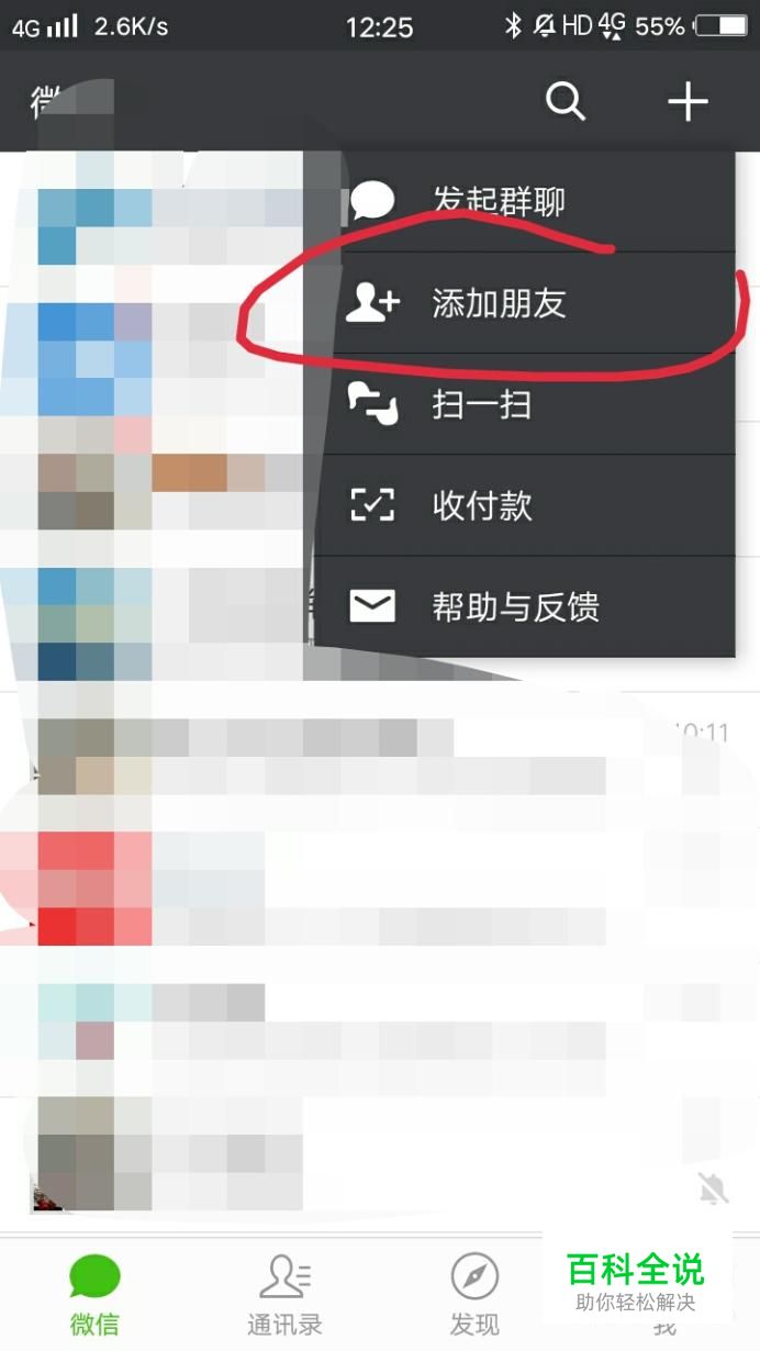打开微信,点击右上角的加号,然后点击添加朋友。