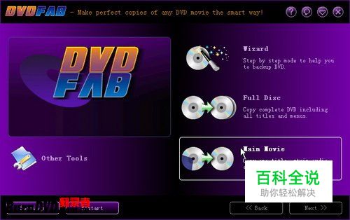 第1步,运行DVDFab Platinum,在程序主界面中提供了三种模式供用户选择。其中“Wizard(向导)”模式是以向导的方式备份DVD9光盘;“Full Disc(全盘)”模式将复制DVD光盘中的所有内容;“Main Movie(主电影)”模式使用户能够有选择地备份音轨、字幕及影片片段等内容。本例采用Main Movie模式,如图2009020427所示。 图2009020427 单击Main Movie选项