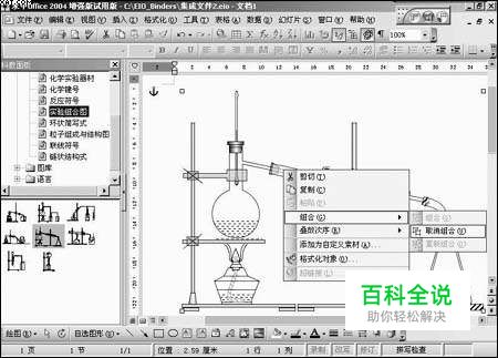 二、素材的自定义和自由组合有什么好处 素材的自定义可以帮助我们制作出需要的图形,保存下来还可以丰富素材库。 1.素材的自由拆装 大家可能不知道,科教编辑器提供的实验仪器和示意图形大多由自选图形拼制而成,所以,也就可以对这些仪器图形进行再次的任意组合和取消组合,并对各个部件进行修改、绘制和重组(如图2)。图2 对素材进行自由拆装 2.素材的添加 对于字符,直接将其拖到科教素材区中就实现了添加。而对于其他素材,则可以通过单击鼠标右键选择“添加为自定义素材”命令来实现。