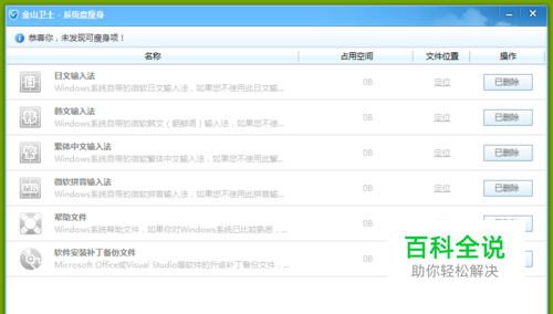 弹出如图所示对话框,可以 发现有很多瘦身项目,因为本人之前将这些可瘦身项目已全部删除,所以全部显示为已删除。