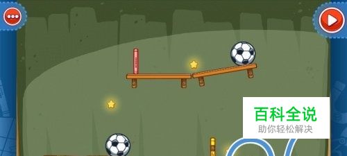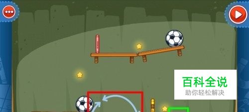 第二步:调整红色方框内长板凳的角度,调整角度后点击右上角的开始按钮,足球就会通过上方掉落下来撞击第二个足球,黄色小球(如上图绿色方框所示)被撞击掉落在红色提篮中,我们就过关了。