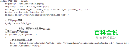 打开申请到的微信支付代码,在上面加入weixin.php define('IN_ECS', true); require('../includes/init.php'); require('../includes/lib_order.php'); $order_id = isset($_GET['order_id']) ? intval($_GET['order_id']) : 0; $order = order_info(0,$order_id); 获取订单信息