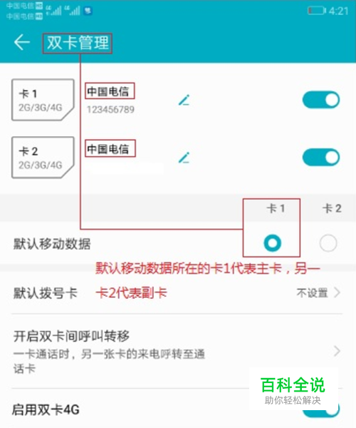 1、当插入双电信卡时,一张电信卡为主卡,一张电信卡为副卡。其中主卡为“默认移动数据”对应的卡,副卡则为另一张卡。