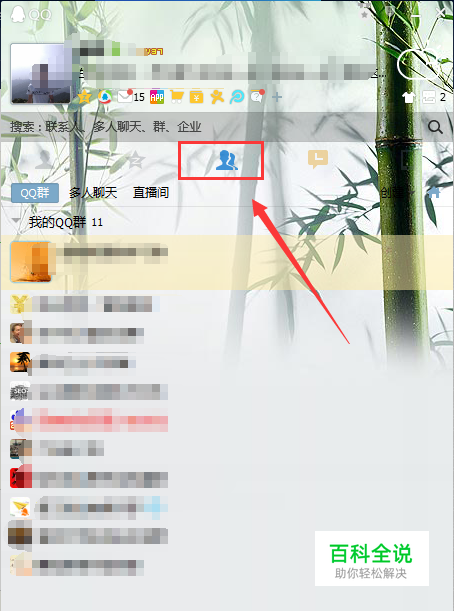 打开QQ,在QQ的页面中,找到上方的2个人头的图标(如下图所示),点击它,那是群列表的按钮。