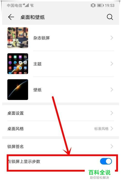 如果“设置”——“桌面和壁纸”页面中,已经开启了“在锁屏上显示步数”功能,但手机锁屏时,仍然不显示运动步数,那么,则可能是主题设置不当引起的。
