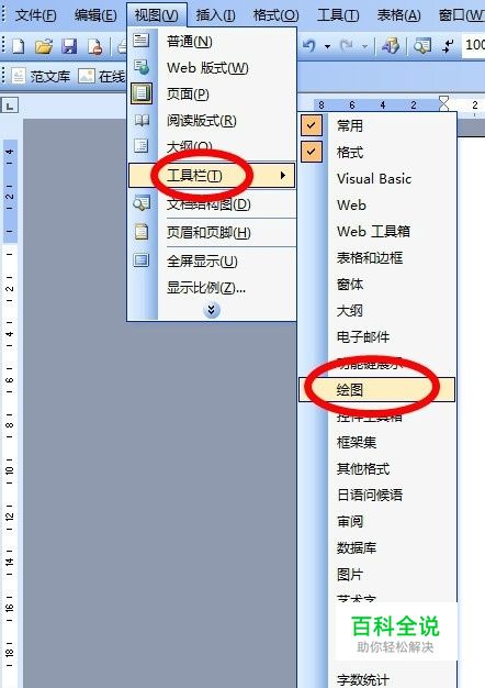 为了画图的方便,一般我们先调出“绘图”工具栏,依次点击菜单栏的“视图”-“工具栏”-“绘图”