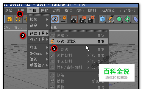 多边形画笔藏在软件界面菜单的“网格”选项这里; 点击“网格”选项,弹出菜单中点:创建工具,再点:多边形画笔。 快捷键是:ME