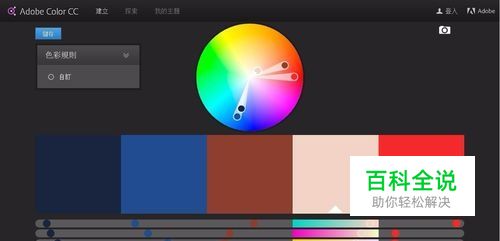 先给大家介绍下网页版的,因为,,,网页版的是中文的(我会原谅你们笑出了声的)。 第一步当然是打开这个网站啦 你会看到如下图所示界面,左上角有建立 探索 我的主题 我们现在看的是建立。再往下一点是色彩规则,具体大家也能看到,就不加以赘述了。有趣的是只有网页是全屏的时候这个色彩规则才会自动展开列表,其他时候都需要用鼠标轻轻抚摸它,这个列表才会展开 中间是一个调色板,看见中间的五个圈圈了吧,对应的就是下面五个色块,它们都是可以随意拖动的(网页背景是黑色,所以你可能只看到四个)此时你已经可以看到不同颜色所对应的参数了。