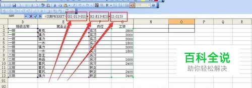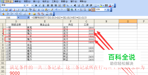 先来一个最基本的用法,如前面所说的,三个箭头所指的分别是,班级区域满足是一班的条件,并且就业企业满足强力这个条件,对同时满足这两个条件行的工资项目求和,很简单吧