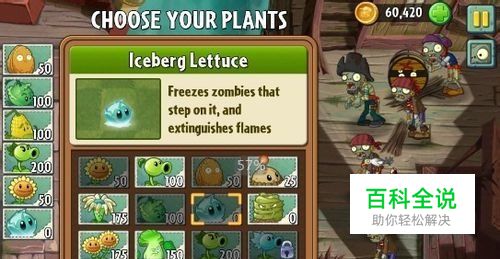植物选择: 这关的要求是12颗植物,怎么搭配12颗才会好呢,所以就不用选125的太阳花,直接50的上,其他冰冻生菜和坚果一定要带,以防不测。