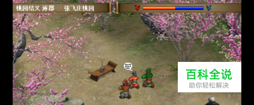 剧情故事发生,刘备与张飞、关羽相遇,并谈话,来到了桃园,并结拜,这就是桃园结义的过程,如图所示
