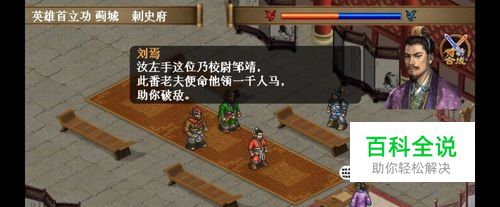 下一个出发点击,就是跟刘焉谈话,并给校尉邹靖相助刘备对抗杀敌,那么点击出战,如图所示