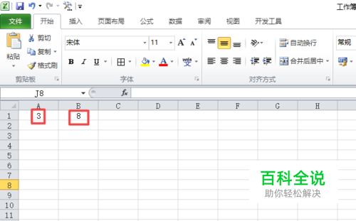 然后我们在单元格中输入两个数字,如图所示;