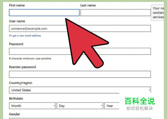 在相应区域输入个人信息。你需要输入姓名、密码、国家、邮编、生日以及手机号码。