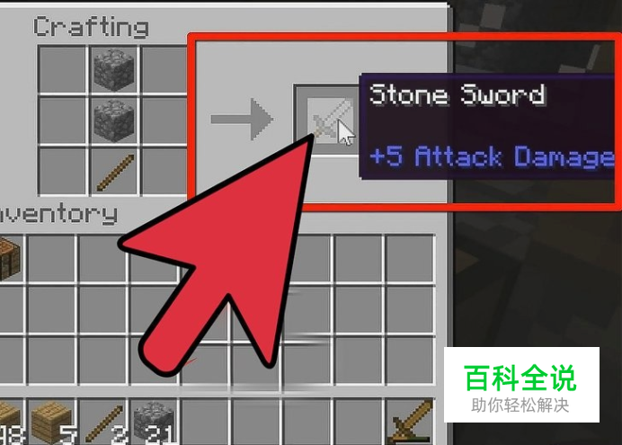 一个木棍放底部,两个圆石放上面。 做出石头剑了。 Shift点击,或拖动石剑到背包里。