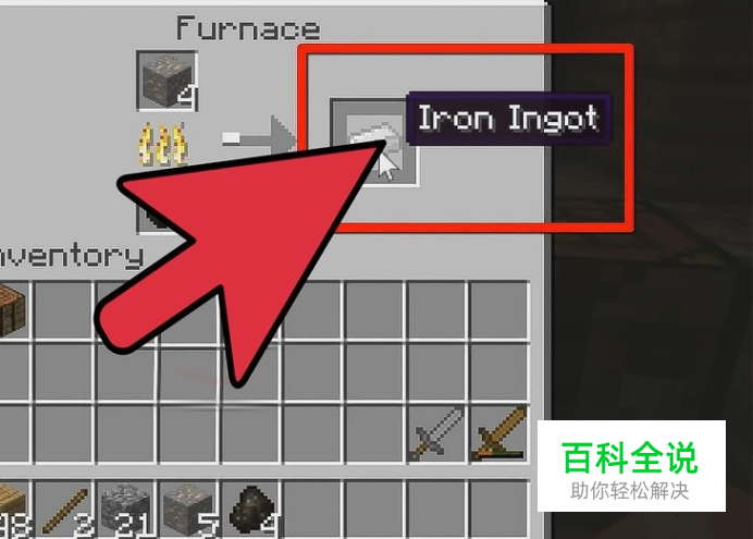 一个木棍放底部,上面放两个铁锭。 做出铁剑了。 Shift点击或拖动铁剑到背包里。
