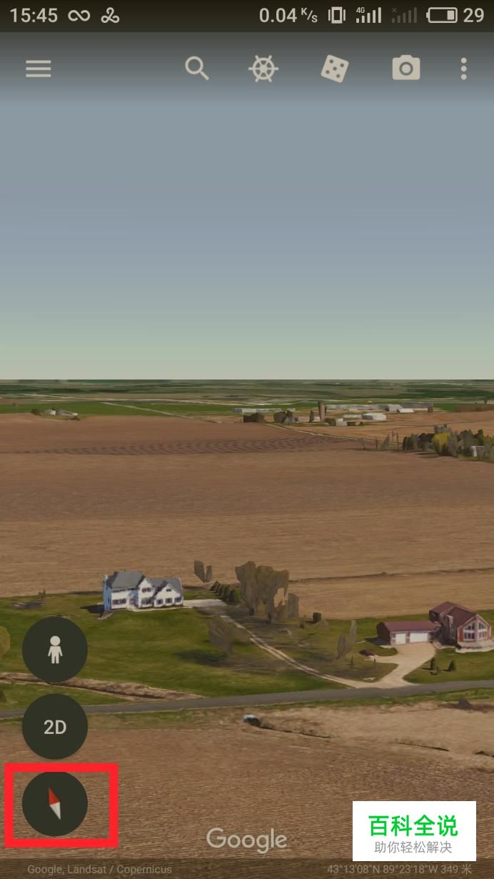 主界面上方右边有一些图标,前两个图标功能与菜单前两个功能一模一样,第三个类似色子的图标你去全球一个地方,领略当地风情;然后是倒数第二个照相机图标,点击之后截取当前视图。剩下一个图标没有多大作用(如果你没有安装谷歌框架)