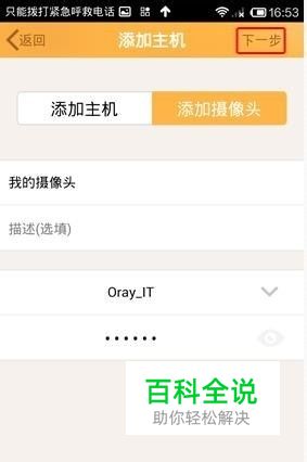 选择“添加摄像头”,填写摄像头名称,描述、选择可使用的wifi并输入密码,点击“下一步”