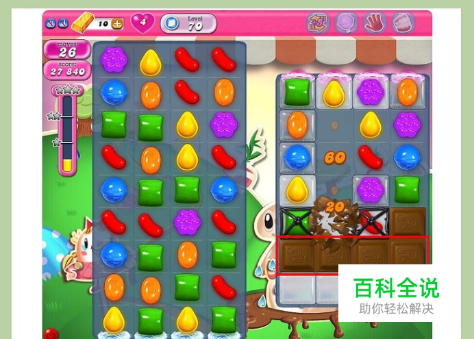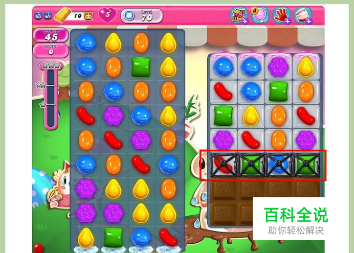 消除巧克力。尽早清除巧克力方块。这也是本关卡最难的部分。你可以使用的条纹糖果来尽快清除巧克力块。 其他特殊糖果也可以发挥作用,例如包装糖果加上条纹糖果组合。