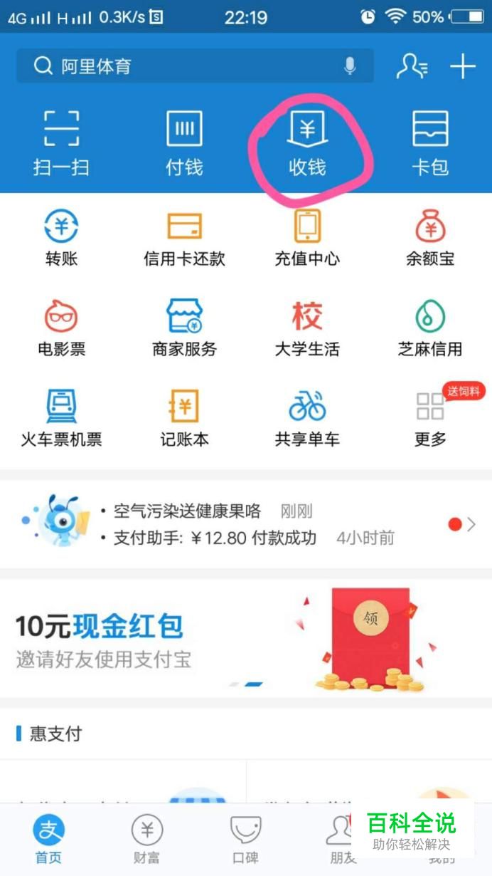 进入支付宝主页面,点击“收款”。