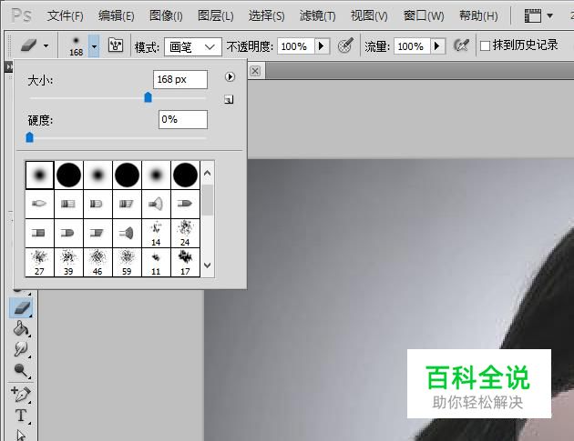 在左边工具栏选择橡皮擦。左上角修改详细参数,画笔选择30号“柔角”,可以让边缘渐淡;画笔大小要根据以要淡化的边缘大小而定和根据实际效果随时调整。硬度选择为0。