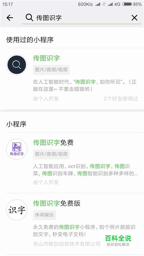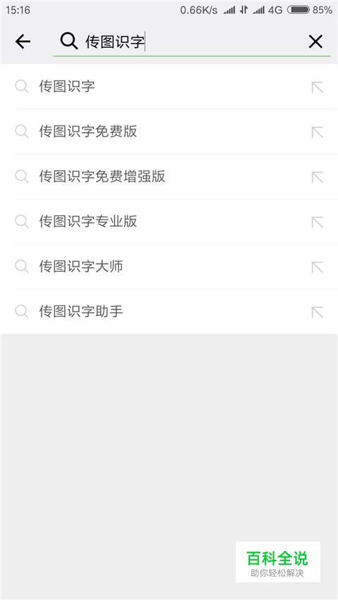 这时我们进入到搜索界面,打出传图识字四个字,这时下方将会出现一堆的推荐,我们点击第一个,然后我们可以看到一个黑色的圆形图标里面有个放大镜,点击这个小程序。