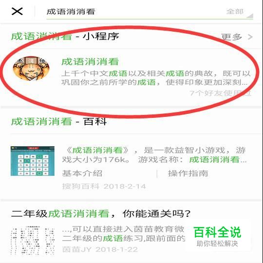 在微信搜索栏中搜索“成语消消看”,找到“成语消消看”小程序,点击进入程序。