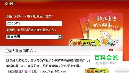 《倩女幽魂》亚运礼包为通用序列号,人人都可凭通用序列号领取亚运大礼包,上图先,有图有真相: 如上图,先在卡密输入框随意输入一串八位数字,选择“倩女幽魂”,然后点击领取,就可以得到一个《倩女幽魂》亚运礼包的通用序列号: qnyh-qn-163-com