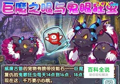 克王国巨魔之眼技能石是在威廉古堡内刷宠获得的。 每天下午的2点到4点,6点到8点可以在威廉古堡遇到鬼眼狂虫。它是一个真正的复仇者,所以我们捕捉它的时候一定要小心,详细的捕捉攻略小a与小w会在第一时间给大家送出,敬请期待!