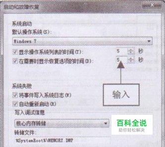 弹出“启动和故障恢复”对话框,选中“在需要时显示恢复选项的时间”复选框,并在其右侧的数值框中输入5,如图2所示