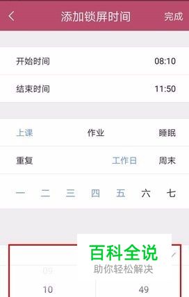 第三步.选择“上课”、“作业”、“睡眠” 三个内容进行选择工作日或周末,并对应进行时间段的设置(开始时间和结束时间),设置好后,点击“完成”按钮。