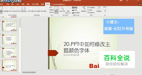 PPT中如何修改主题颜色字体 2025-05-27 05:01:00 PPT中如何修改主题颜色字体,下面就和大家来聊聊。 操作方法 01 打开PPT后,选择“视图母版”。 02 对母版中的字体颜色和字号进行修改。 03 然后点击幻灯片“母版”。 04 关闭母版视图即可。 赞 (0) 相关推荐 怎么在PPT中插入添加主题字体 PPT是一个办公应用程序,它是我们办公.学习中不可多得的好帮手.不少小伙伴还不太熟悉有关的操作技巧,因此常常存在困惑.比如:很多用户不知道如何在PPT中插入添加主题字体,小编今天就来为您解答这个问题 ... 如何在PPT中添加茅草“主题和”基本“主题字体 如何在PPT中添加茅草"主题和"基本"主题字体 操作方法 01 要求为演示文稿应用"茅草"主题和"基本"主题字体 02 单击&qu ... PPT中如何使文字颜色渐变? wps是一款十分方便实用的办公软件.今天小编就给大家介绍一下ppt中如何使文字颜色渐变并且变得更好看. 操作方法 01 首先在ppt中输入你要写的字,字体根据自己的喜好选择.然后选中输入的字,单击鼠标 ... PowerPoint 2013怎么修改主题颜色 PowerPoint 2013怎么修改主题颜色 1.对幻灯片应用主题样式后,在"设计"选项卡的"变体"组中单击"其他"按钮 ,在打开的下拉列 ... ppt中变换证件照背景颜色教程 相信很多小伙伴在日常生活中都会用到证件照,不同的场景需要用到不同背景颜色的证件照,在ppt中我们就能很方便地对证件照的背景颜色进行更换,那么具体怎么做呢?下面小编就来为大家介绍.具体如下:1. 首先, ... PPT中怎么修改图形的不透明度? PPT操作过程中,常常会用到图通的图形组合配合排版,使其看来更加直观与美观,其中修改不同图形的不透明度也是经常见到的,下面就来给大家详细介绍在PPT中如何修改不透明度.下面以WPS的PPT文档为例. ... 在PPT中怎么增加特殊新字体? 漂亮和特别的各类字体,可以为PPT增色不少.但PPT系统默认自带字体有限,如何才能给我们的ppt中增加特殊新字体呢?小编根据亲身经历,示例中以方正静蕾字体为例,为PPT中增加特殊新字体. 方法/步骤 ... 如何在同一个PPT中制作不同主题的幻灯片? 相信很多小伙伴在日常办公中都会用到PPT,在其中如何才能制作不同主题的幻灯片呢?方法很简单,下面小编就来为大家介绍.具体如下:1. 首先,在PPT中新建一个空白文档.2. 点击页面上端的"设 ... 如何调整手机QQ阅读app中的个性主题与字体 日常生活中,随着手机的普及,移动阅读也已经越来越火热,当我们在使用手机QQ阅读app进行阅读时,如何调整其中的个性主题与字体呢?接下来就由小编来告诉大家.具体如下:1. 第一步,打开手机并在桌面找到Q ...
