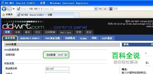进入后.点一下红框中的设置.再点一下黄色框内的基本设置,然后绿色框里选您的上网方式.默认就是DHCP自动获得.如果您是用这种上网方式,那么直接连好网线就可以上网,但是一般的路由器及光猫的IP地址都是:192.168.1.1,跟DD-WRT一样就会有冲突.那么就要修改一下路由器IP地址就可以上网了.方法如下图