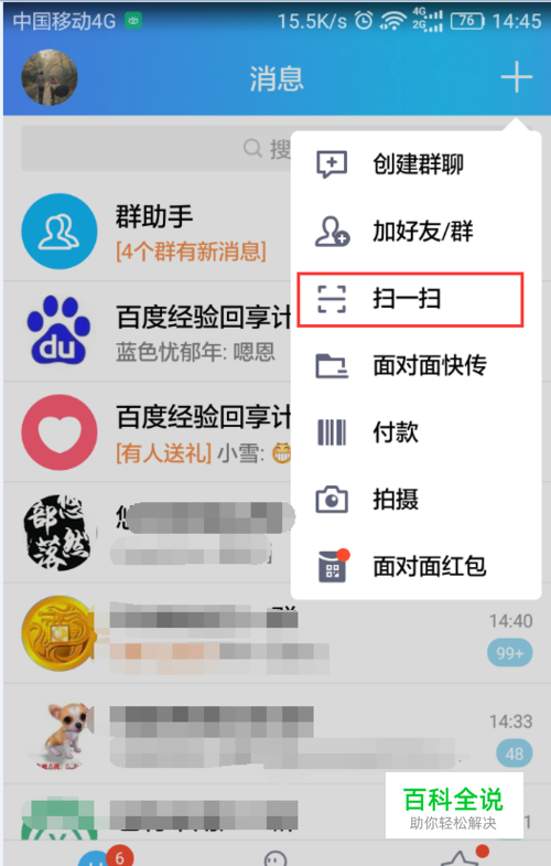 手机打开手机QQ,在消息界面中,点击右上角的“+”号,选择“扫一扫”功能