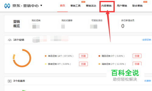 然后进入“营销中心”页面,再点击"内容营销"几个字,也会弹出新的页面,也就是“内容营销”页面,
