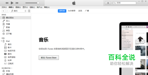 首先,我们点击打开iTunes,然后将自己的ipad或者iphone通过数据线与电脑相连,可以看到这个iTunes页面是没有应用程序选项的