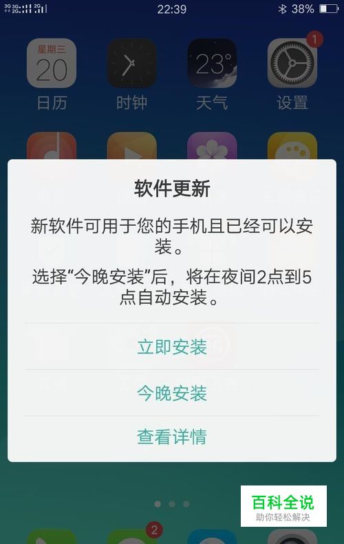 打开欧珀手机,跳出一个弹窗提示,软件更新的通知窗口,提示你当前需要更新安装的软件已经可以在你的手机进行安装,还有选择更新软件的安装时间.